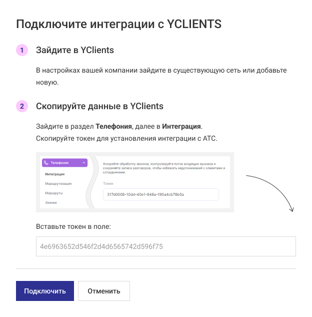 Скопируйте токен телефонии и перейдите в АТС. В разделе «Настройки» в правом верхнем углу выберите «Интеграция с CRM». В списке CRM-систем найдите YClients и нажмите «Подключить».