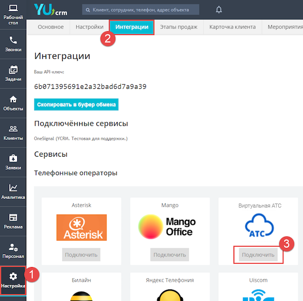 5. Откройте YUcrm в новом окне и перейдите в раздел «Настройка» – «Интеграции». Найдите вашу АТС и нажмите «Подключить».