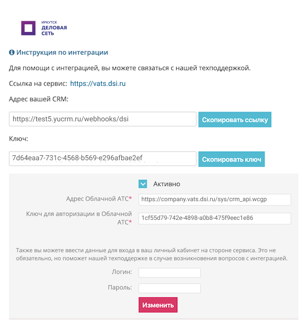 7. Скопируйте ссылку для отправки информации и Ключ из YUcrm и вставьте их в соответствующие поля в панели управления вашей АТС.